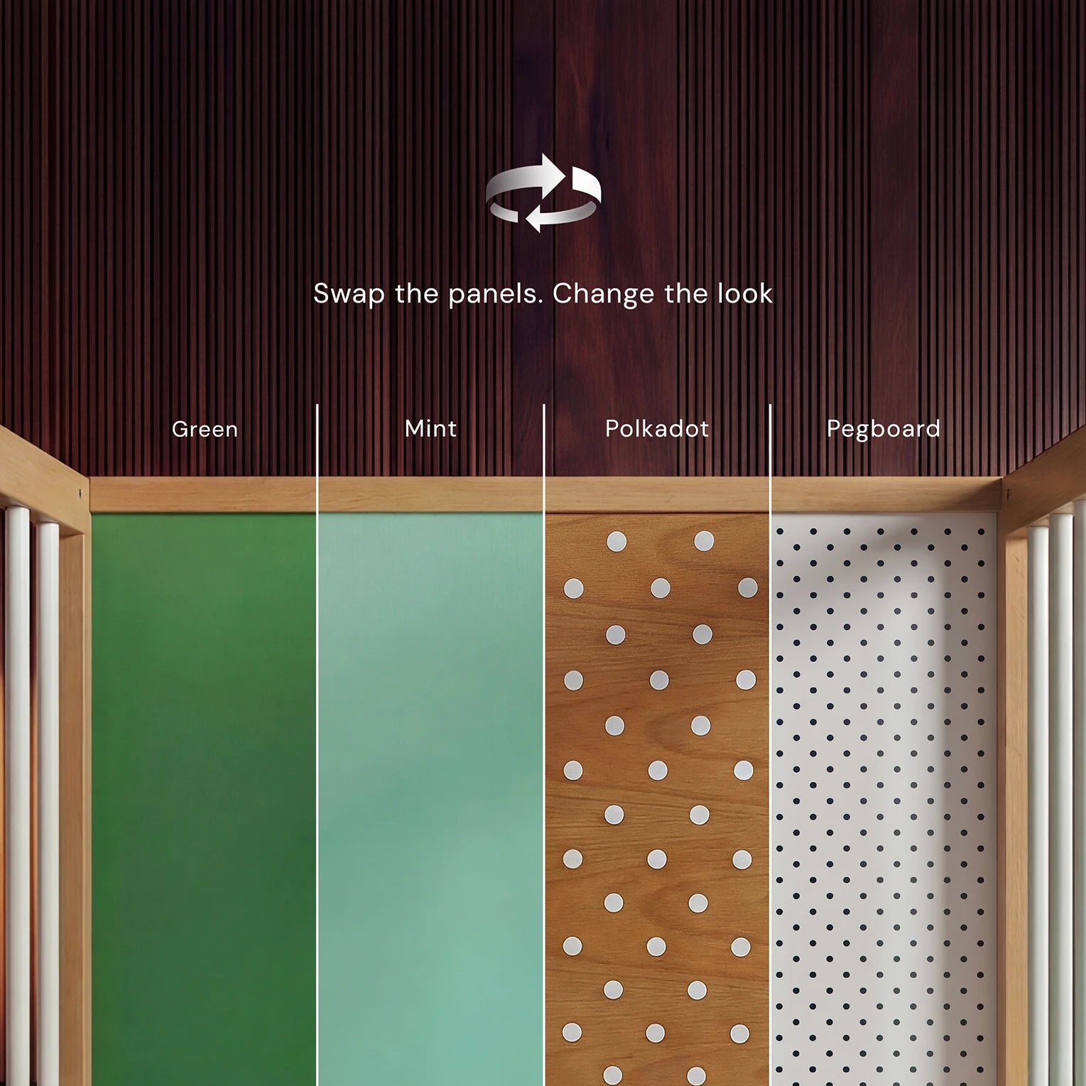 The Bold Baby Cot isn’t just a cot – it’s a canvas for creativity. With four double-sided panels in beautiful colours and patterns, you can transform its look in minutes to suit your style. It’s the first cot that encourages parents and children to shape and change their space together.
