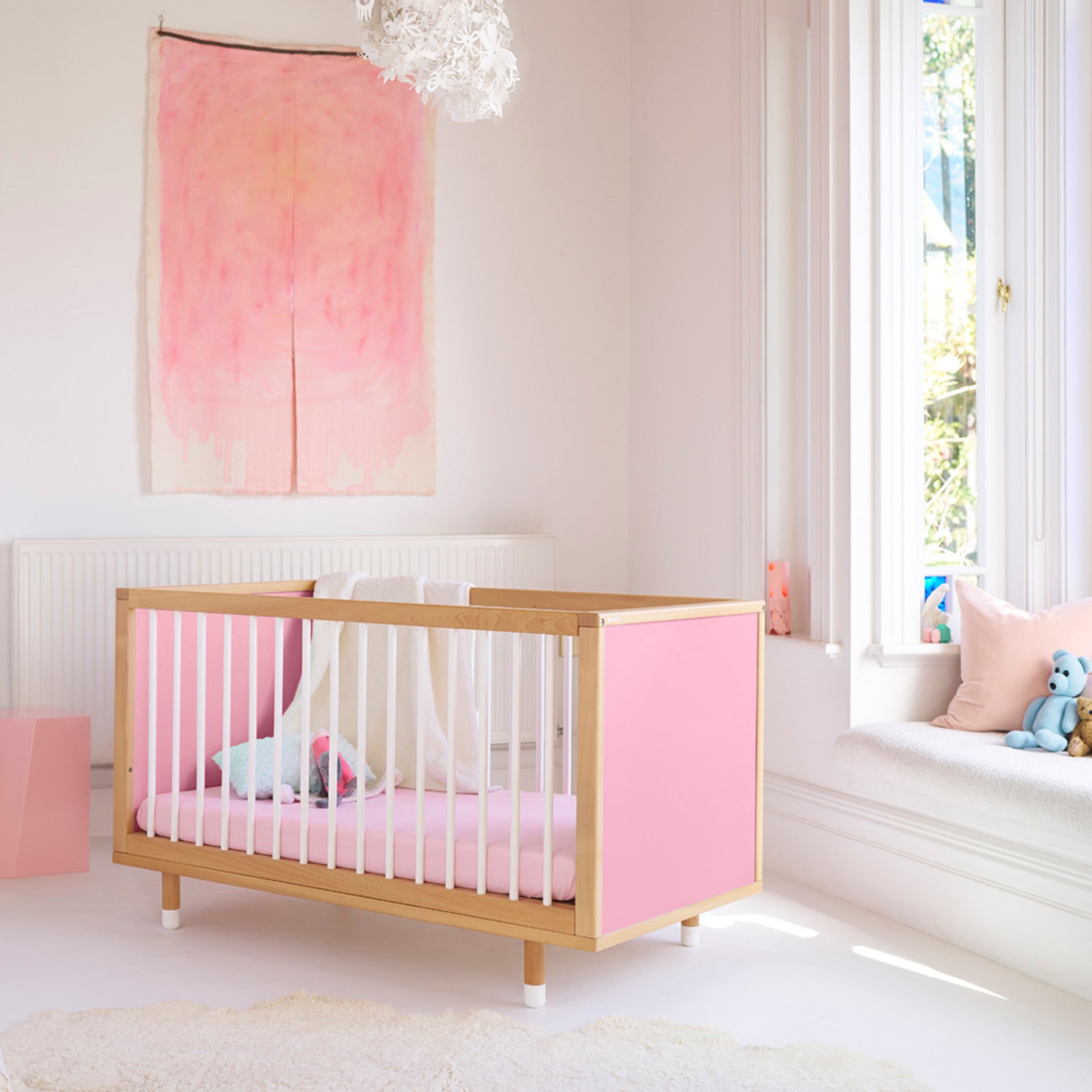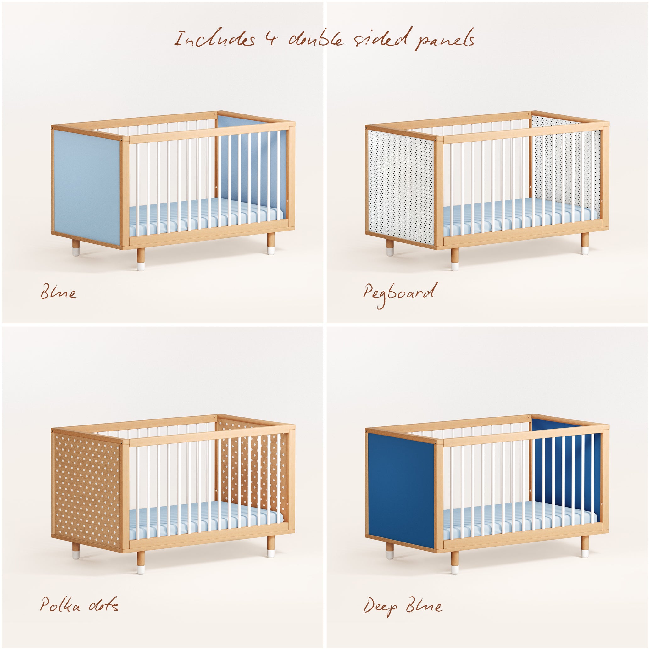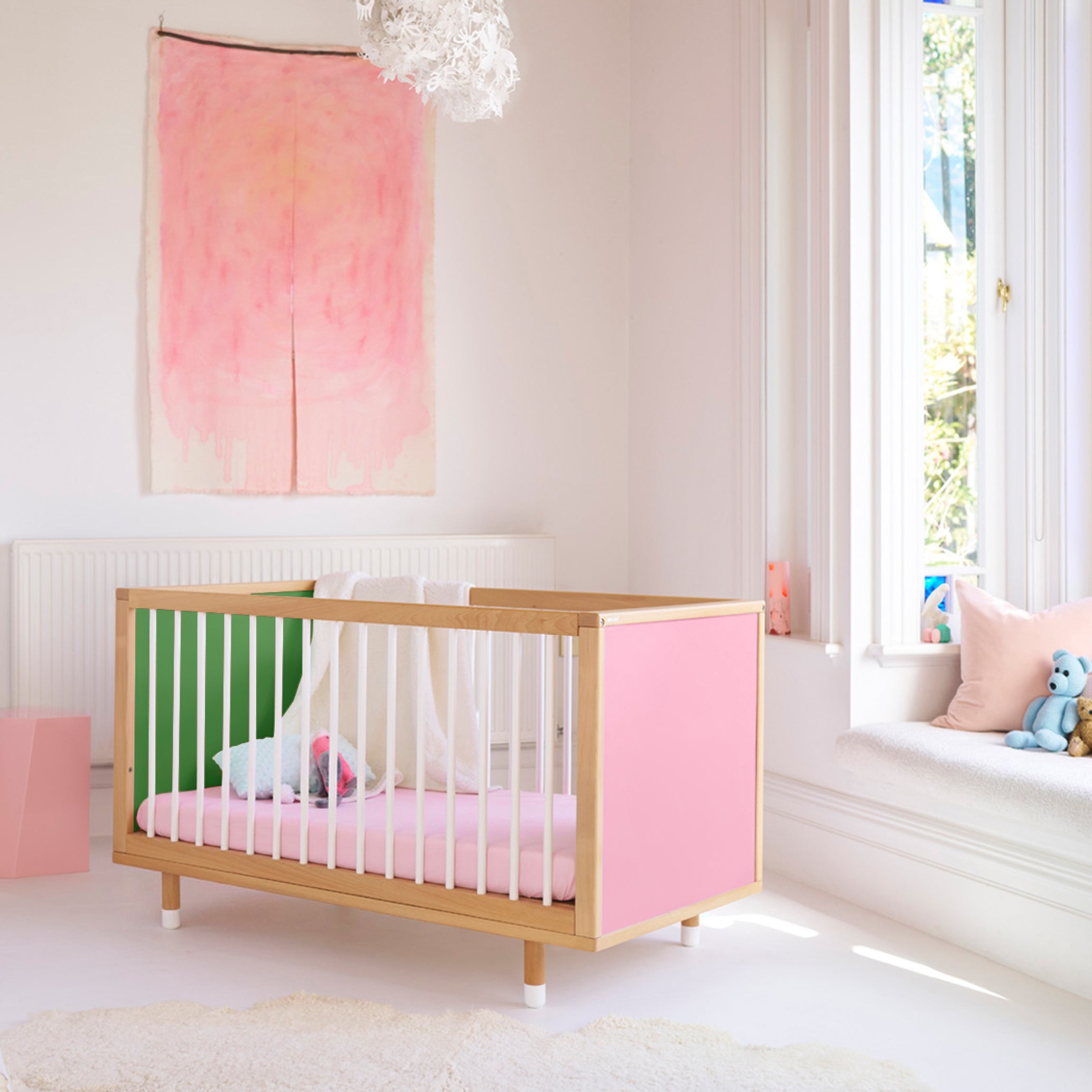 The Bold Baby Cot isn’t just a cot – it’s a canvas for creativity. With four double-sided panels in beautiful colours and patterns, you can transform its look in minutes to suit your style. It’s the first cot that encourages parents and children to shape and change their space together.