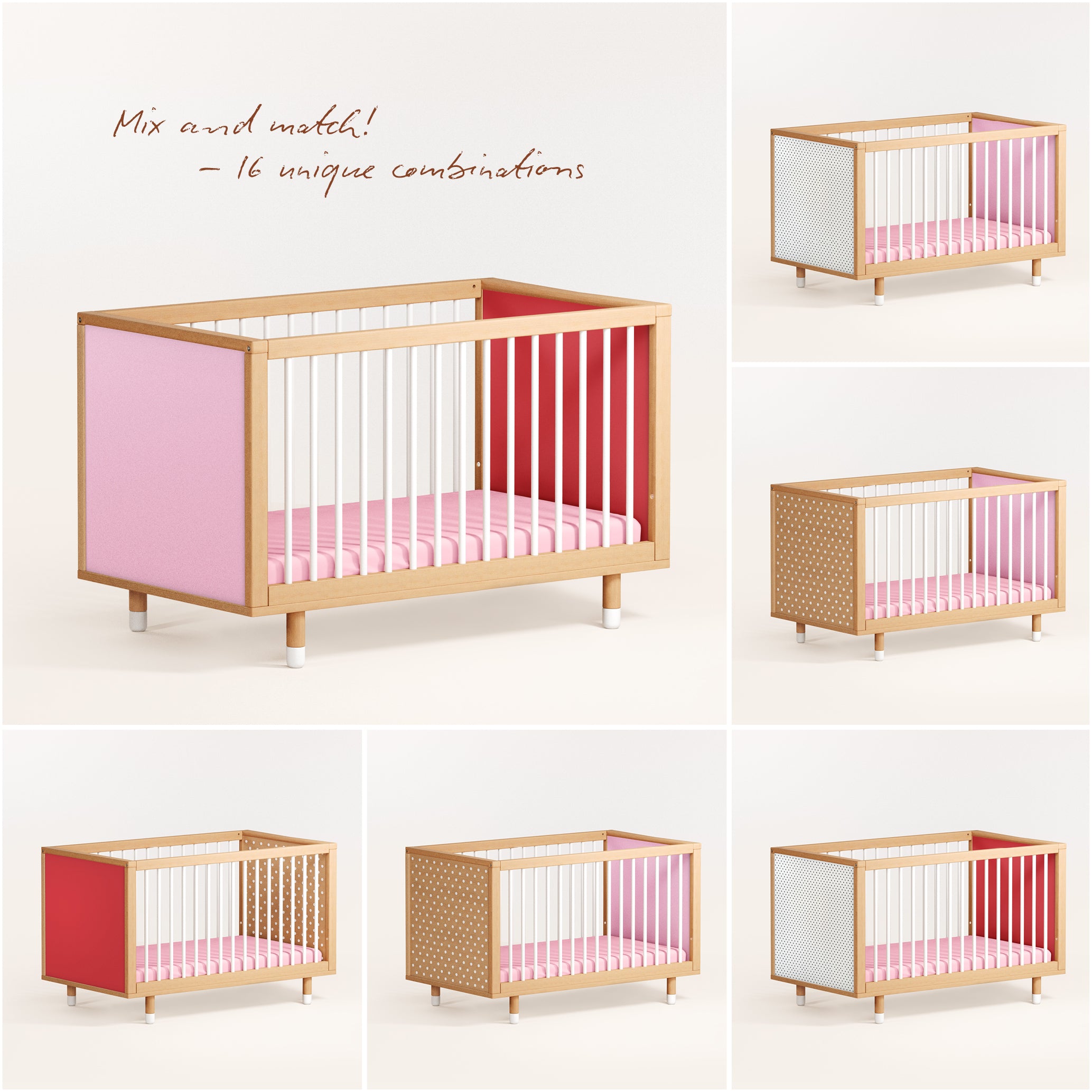 Each cot includes four double-sided panels – two colourful and two patterned. That means 16 possible looks straight out of the box. You can flip or swap them in minutes.