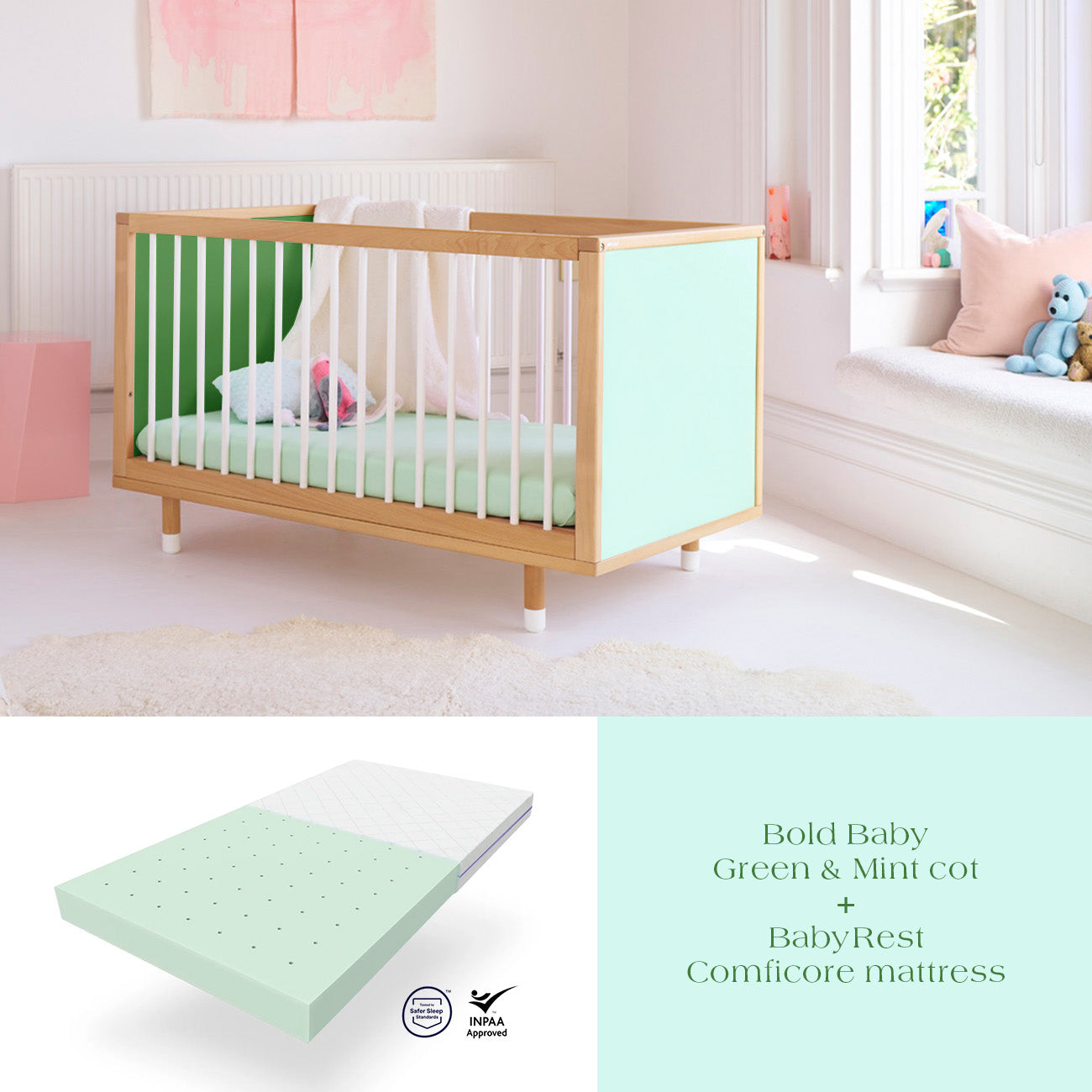 Bold Baby Green and Mint Cot + ComfiCore Mattress Bundle