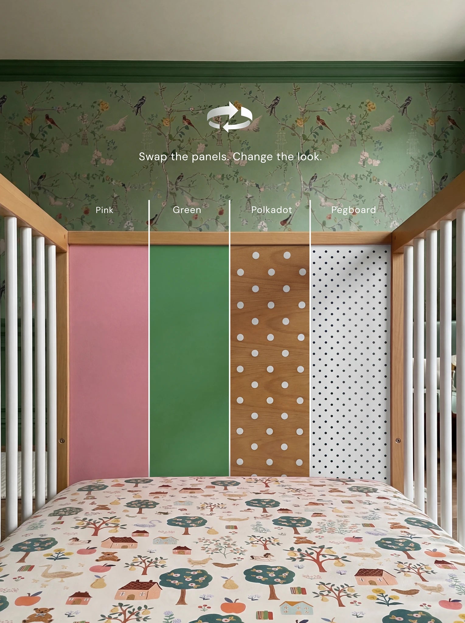 Each cot includes four double-sided panels – two colourful and two patterned. That means 16 possible looks straight out of the box. You can flip or swap them in minutes.